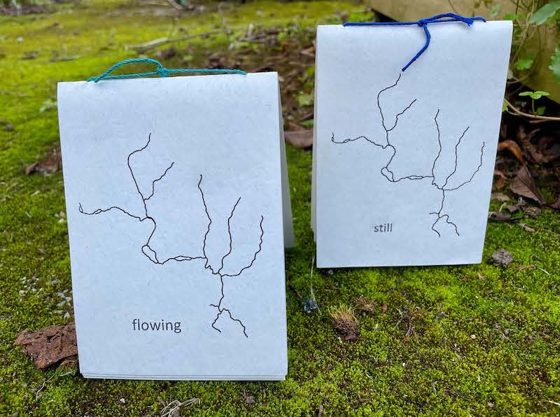 The booklets exhibited here were written and made by Wallace, who lives by the River Leven. They are invitations, guides and gifts. Inside, the booklets are brief guides to finding a place, keeping safe, settling and staying with the flow of water. Too, there are prompts offered, specially written to each person, questions that they could consider while they are by the waters, ones that directly and indirectly call up ideas of change, climate and the future. The booklets were given as gifts, and as a further invitation to a get-together and meal with the other participants to talk over their experiences and ideas and to meet the Future Machine.